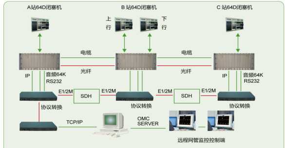采用整機熱備 電纜為主,光纜為輔 光路可以配置為音頻64K,光纖2M傳輸接口,使用于既有線。